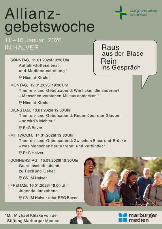 Wir beginnen mit einem Allianz-Gottesdienst in der Nicolai-Kirche am Sonntag, 11.1. um 10:30 Uhr und gehen weiter durch die einzelnen Gemeinden jeweils um 19:30 Uhr mit einem Gebetsabend.